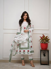 Grace meets tradition in this white suit set, adorned with intricate handblock prints in refreshing red and green motifs. The straight kurta, paired with matching pants and a beautifully printed dupatta, creates a timeless ethnic look. Crafted in breathable cotton, this ensemble is perfect for festive gatherings, family functions, or casual daytime elegance. A classic piece that blends comfort with cultural charm.