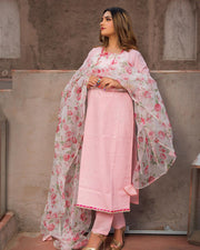 A refined kurta featuring delicate embroidery along the neckline and yoke, paired with a coordinated bottom and a sheer floral-printed dupatta. An effortlessly graceful ensemble, ideal for festive gatherings, daytime celebrations, and elegant occasions.